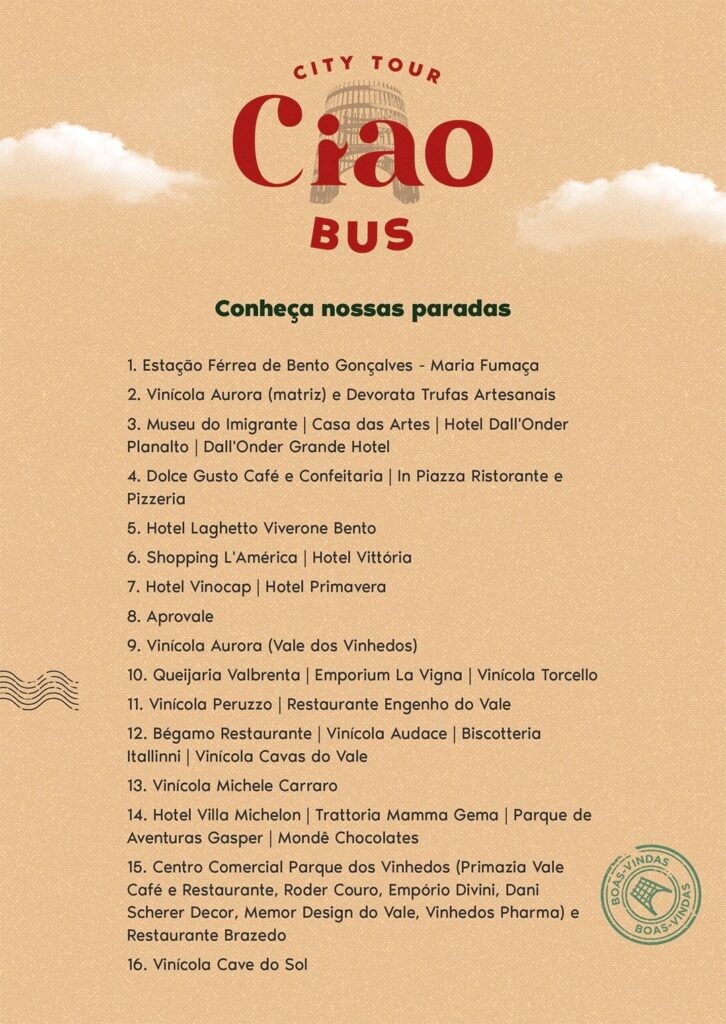 O Ciao Bus é um city tour panorâmico no sistema hop on/hop off, permitindo que os passageiros embarquem e desembarquem em mais de 30 paradas ao longo do dia. Com saídas de hora em hora, das 9h às 16h, aos sábados e domingos, o passeio oferece flexibilidade para explorar pontos turísticos, vinícolas, restaurantes e cafeterias da região.